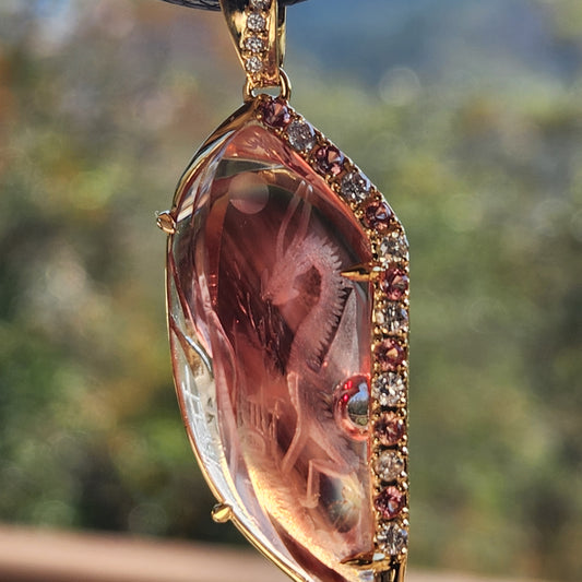 23.22 ct Oregon Sunstone Carving Dragon Pendant set in 14 kt Gold.