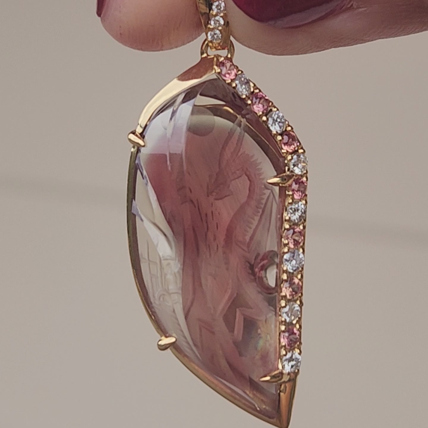 This exquisite pendant features a captivating sunstone, expertly carved and set in lustrous 14k yellow gold. The unique sunstone displays a beautiful range of warm hues, with a delicate carving adding an artistic touch. Complementing the radiant sunstone dragon are sparkling diamonds and vibrant blush sapphires, meticulously set along one side, enhancing its elegance and brilliance. This piece is a true statement of sophistication and natural beauty.